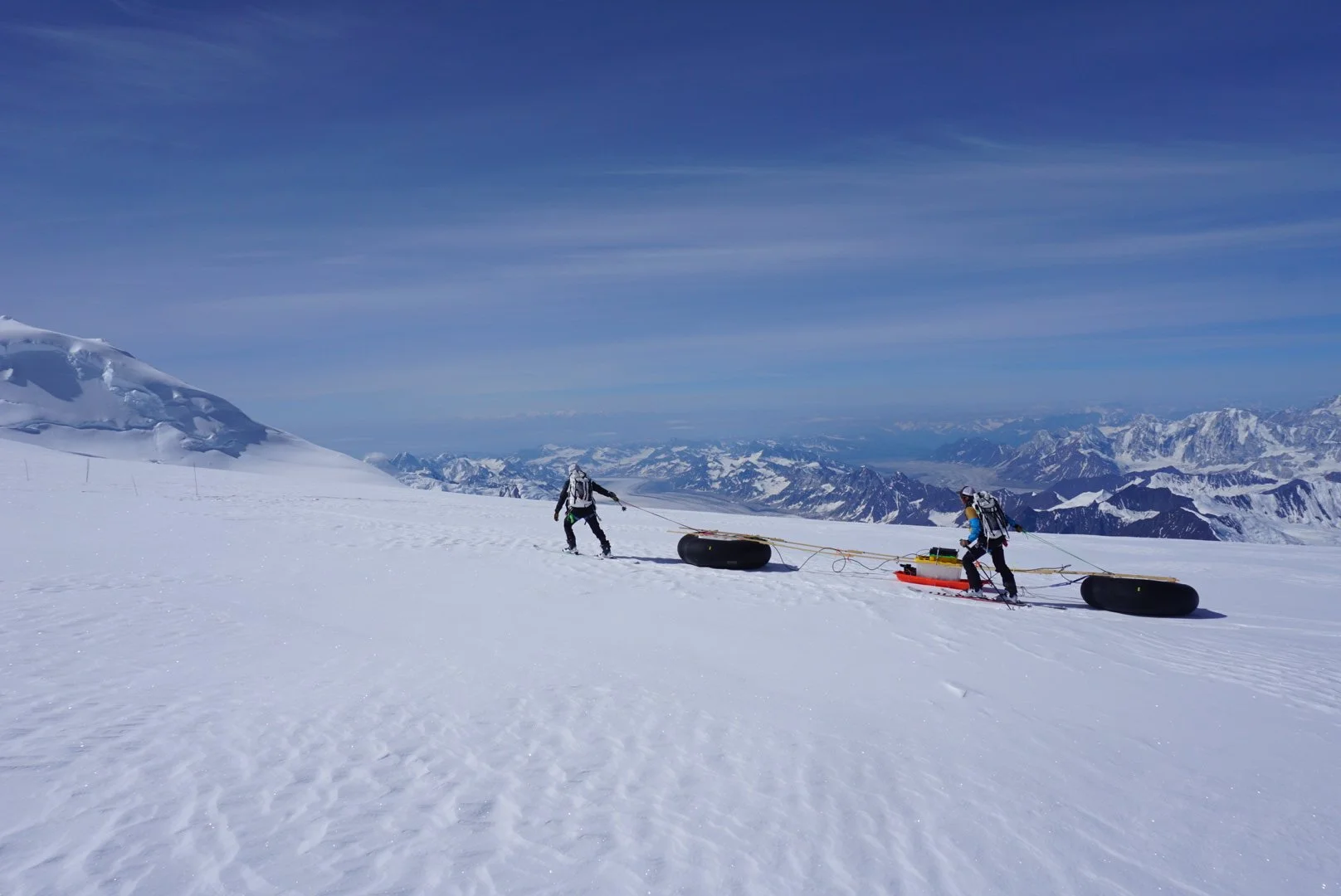 Dragging radar systems around at 12,000’ is hard work! Here two team members deploy an innovative new approach to repeat aPRES radar measurements, with a wood frame ensuring that the two antenna can maintain identical spacing on repeat measurements weeks apart.