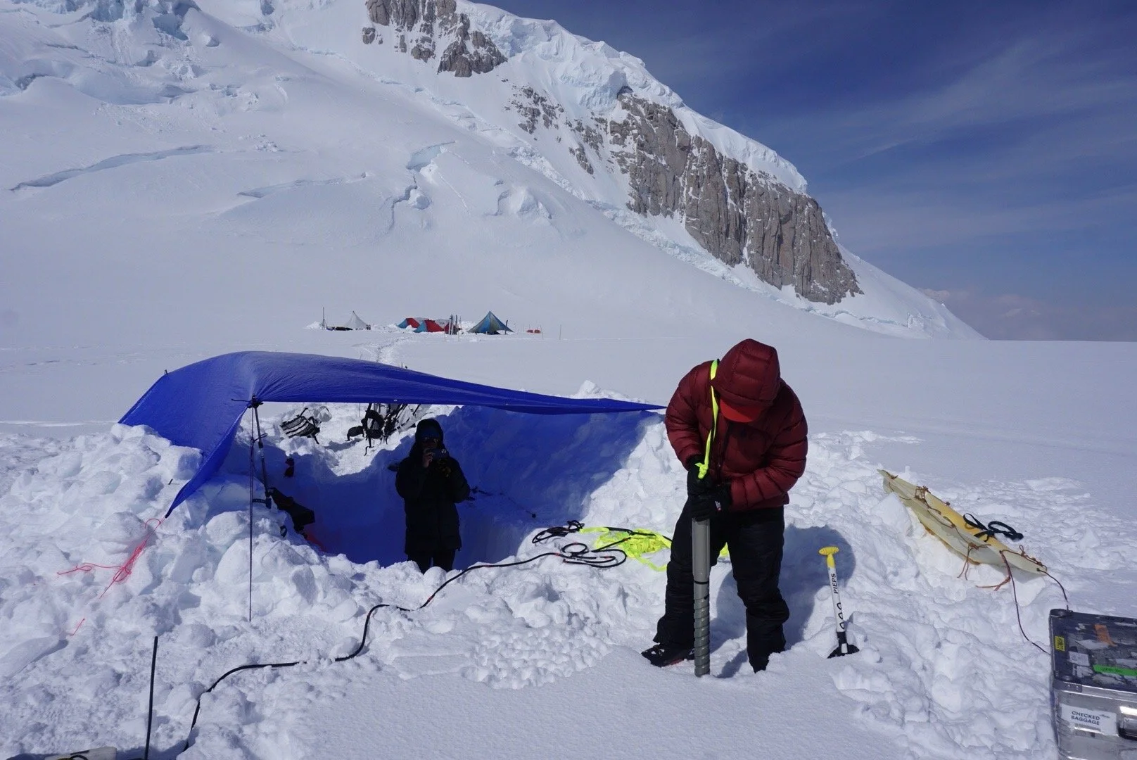 A covered drill tent kept us out of the wind and kept the ice cool durring processing. We used a small 2” stamfli drill powered by solar panels. Living the drill manually was a workout, but helped us save on weight.