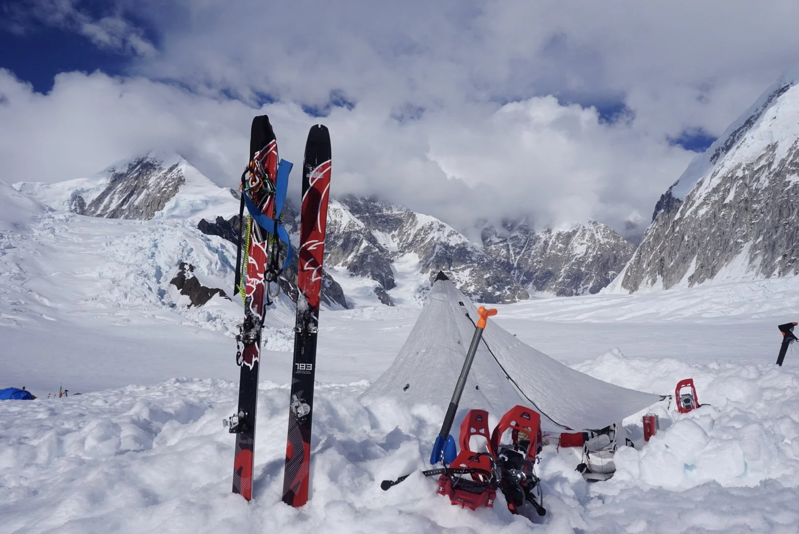Camp 1 on Denali’s West Buttress, with my skis and harness sitting in front of our cook tent. Denali, shrouded in cloud, sits behind.